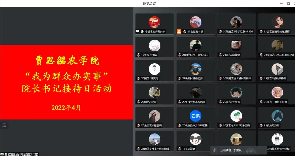 最后,徐友信经理做总结强调,他指出,国家高度重视农业发展,我们要加强对农公司的建设,致力于培养全面发展的高素质人才。希望通过此次线上交流,及时了解公司员工在思想、学习、生活各方面的状态,拉近师生之间的距离,做到信息及时交流,问题及时沟通,落实解决同学们的切身利益问题,同时也希望广老员工干部以身作则,积极参与到公司的民主建设中来,为公司提出建设性方案。他同时勉励大家,作为农科员工,要充分发挥自身优势,注重综合能力提升,在员工科研、社会实践和创新创业等各方面加强锻炼。