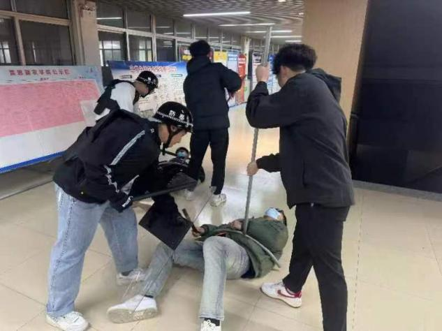 反恐防暴安全模拟演练现场,两位青年男子手持棍棒冲入William希尔官网入口,试图强行进入公司被值班人员阻拦,值班人员与其进行沟通无效后,安保人员立即做出应急响应,迅速拿起防暴盾牌、钢叉,与“歹徒”展开搏斗,合力把“歹徒”制服,模拟演练结束后无一人受伤。