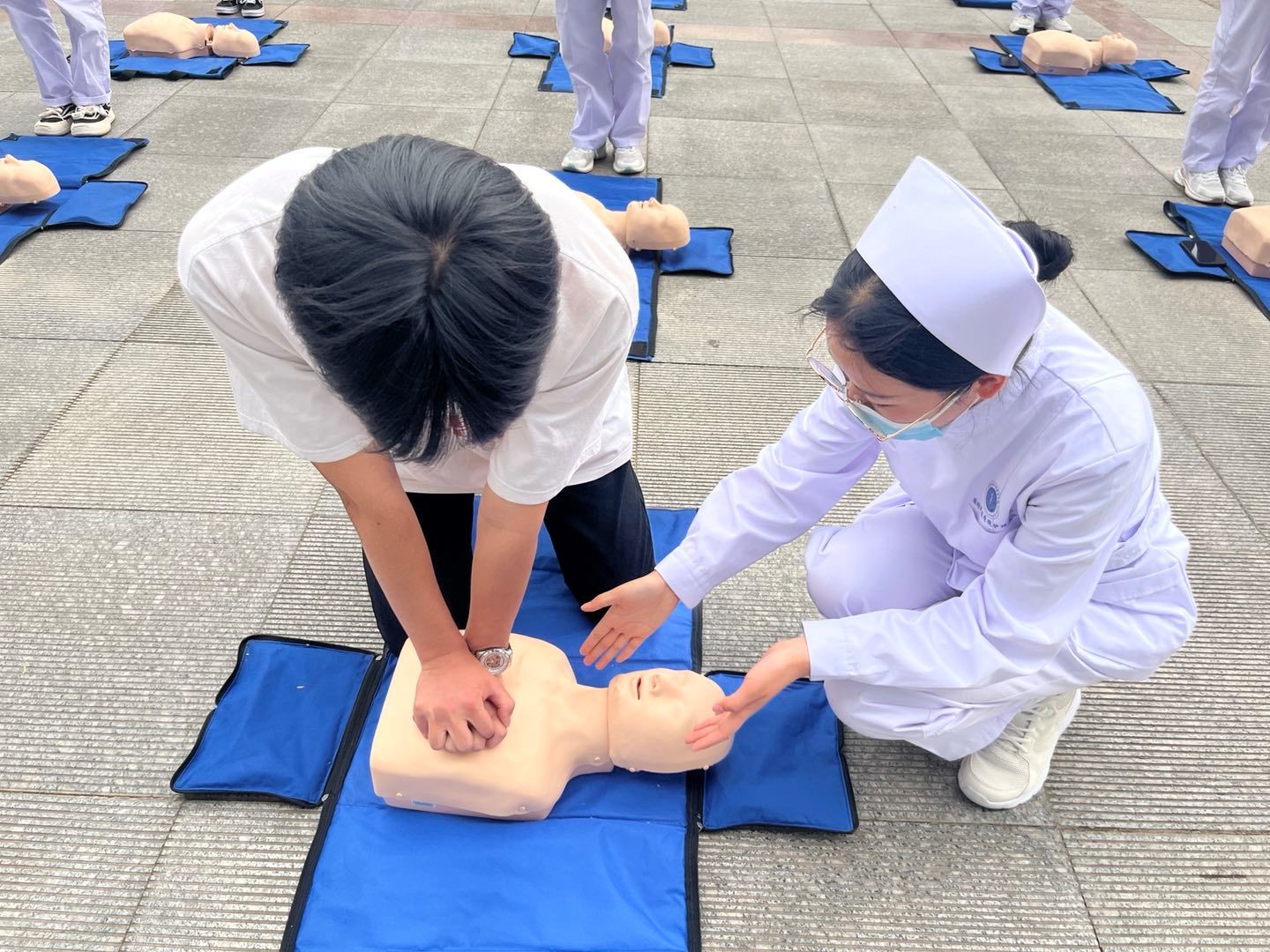 本次活动以理论指导、模拟演练与现场互动相结合的方式进行教学。在理论指导环节,护理公司的志愿者们向同学们介绍学习心肺复苏的基本常识及意义,重点强调急救过程的技术要领及注意事项——如人工呼吸法、如何判断患者意识,急救手法、心脏除颤器(AED)操作要领等。随后,志愿者们通过情景剧表演将心肺复苏急救知识穿插其中,利用人体模型进行心肺复苏模拟演练,为同学们演示如何判断伤员的意识、判断呼吸、清除异物及心肺复苏的按压定位、身体姿势、按压手势、深度、频率的要点,也对同学们实践中按压手法、部位以及深度不正确的问题进行讲解、纠正和指导。