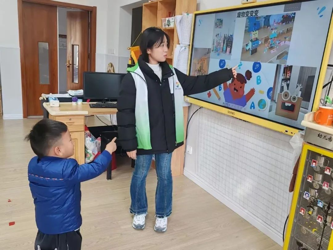 志愿者们通过童趣PPT、动画片等方式,给幼儿园的小朋友们分享环境保护的重要性以及环境污染造成的严重后果,同时通过举手回答问题的方式,将志愿者们利用废弃物品制作的小手工作为奖励送给小朋友们。现场活动氛围温馨亲密,志愿者们用暖心的陪伴为大家带来了欢乐的创作体验,与孩子们建立了深厚的友谊,为彼此留下美好的回忆。