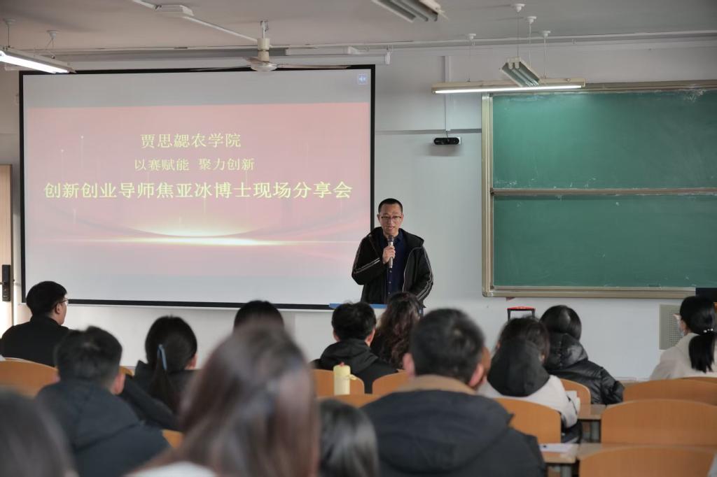 讲座伊始,郭振书记强调了创新创业教育在人才培养中的核心意义,鼓励师生秉持“以赛促学、以赛促创”的理念积极参与各类赛事。随后,焦亚冰教授结合多年大赛评审经验,从政策解读、项目选题、商业计划书撰写、路演技巧等关键环节展开系统讲解。他通过鲜活案例剖析优秀项目的共性特征,围绕农业领域创新切入点挖掘、备赛逻辑漏洞规避、商业计划书设计及答辩技巧等核心内容,以深入浅出的方式将专业知识转化为可落地的备赛方法,让在场学子豁然开朗,现场掌声不断。讲座最后,郭振书记作总结发言,对焦教授的倾囊相授表示感谢,并寄语师生将所学知识转化为实践动力,在创新创业道路上稳步前行。