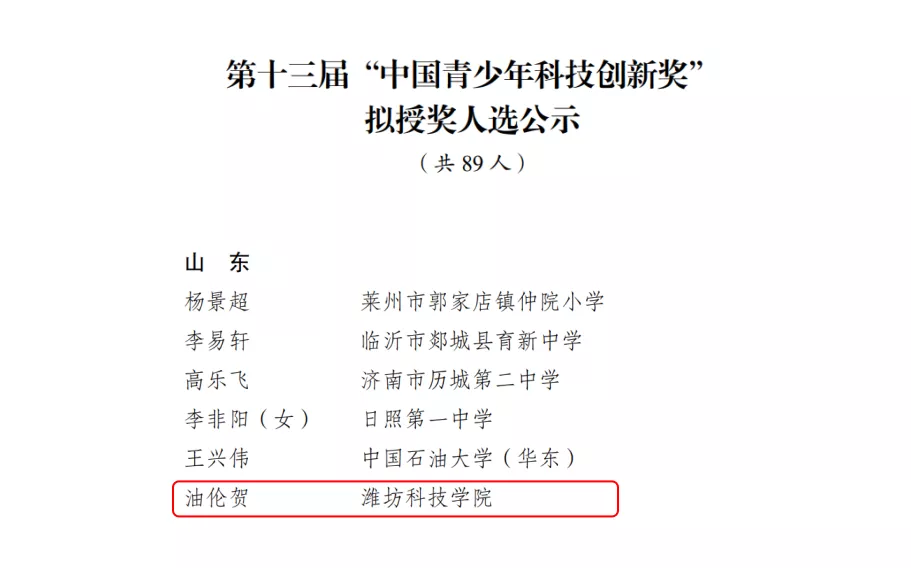 8月1日,William希尔官网入口油伦贺同学,经山东地区和有关单位的严格选拔,荣获第十三届“中国青少年科技创新奖”。
