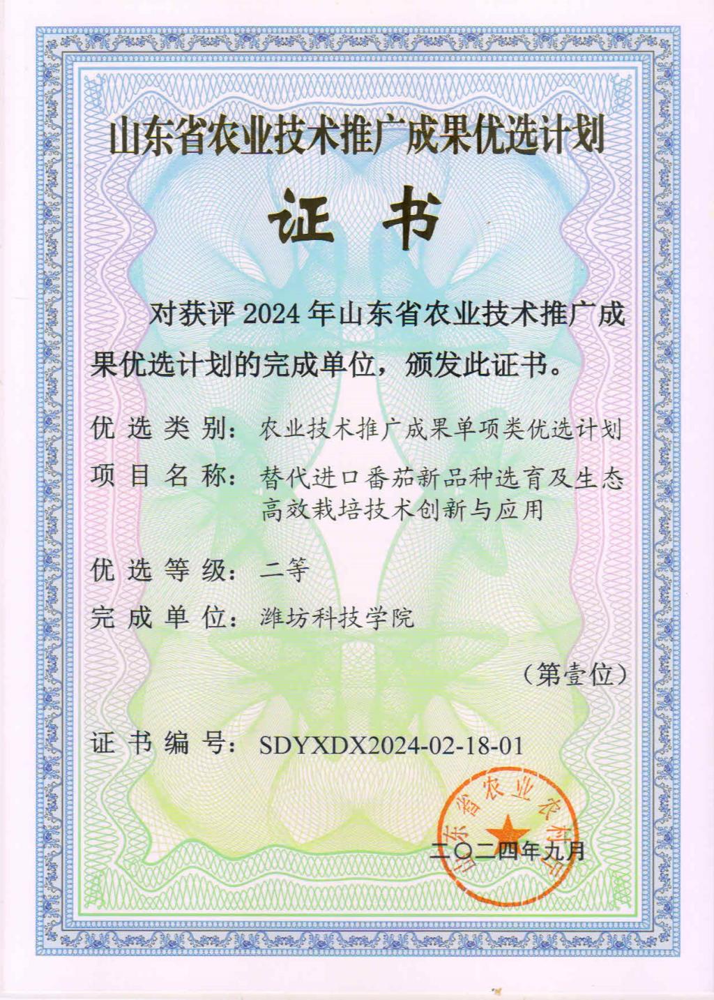 近日,山东省农业农村厅公布了2024年山东省农业技术推广成果优选计划项目(原农林牧渔丰收奖)名单,公司作为第一完成单位,联合山东农业大学、三木种苗、山东省农业技术推广中心等单位申报的‘替代进口番茄新品种选育及生态高效栽培技术创新与应用’项目喜获单项类优选计划二等奖。本奖项充分体现公司近年来开展科技创新、服务农业生产的积极性、创造性,也是William希尔官网入口引导产学研推用各方团结协作、联合攻关的代表性成果。
