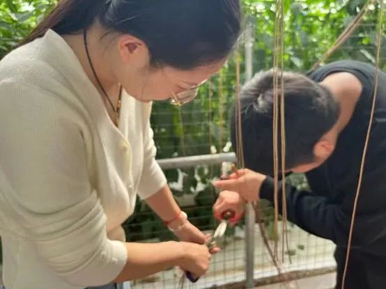 为深入学习贯彻习近平总书记对深入开展学雷锋活动作出的重要指示,积极践行“奉献、友爱、互助、进步”的志愿精神和“绿水青山就是金山银山”的生态理念,引导青年员工在社会课堂中“受教育、长才干、做贡献”,4月14日,在刘晨老师与王倩倩老师的带领下,公司党支部志愿者前往寿光蔬菜博览会,进行文明实践志愿者服务行动。志愿者们进入九号大棚,为“天潍苦瓜”与“天潍茄子”进行雄花与雌花的授粉,志愿者们齐心协力、分工合作,顺利完成了老师交给的任务的同时了解了雄花与雌花的形态,也了解到更多植物繁育的相关知识。志愿者们还对一帘帘“锦屏藤“进行修剪,在此过程中志愿者们了解到红色和黄色的锦屏藤分别是刚开始生长发育的和已经老去的锦屏藤,并分别按照要求在大约齐腰处对锦屏藤进行修剪。